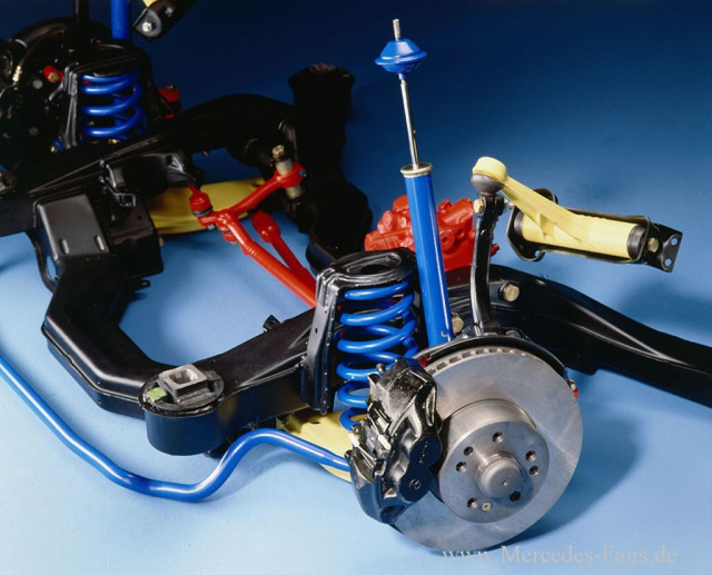 Die Vorderradaufhängung des großen Mercedes wartete mit einer eigens konstruierten Doppelquerlenker-Achse auf. Indes hatten die Mercedes Ingenieure die Hinterradaufhängung von der Raumlenkerachse anderer Baureihen in modifizierter Form übernommen. Zwei weitere Konstruktionsdetails abklappbare Außenspiegel und ausfahrbare Peilstäbe als Rückfahrhilfe sollten das Manövrieren erleichtern.