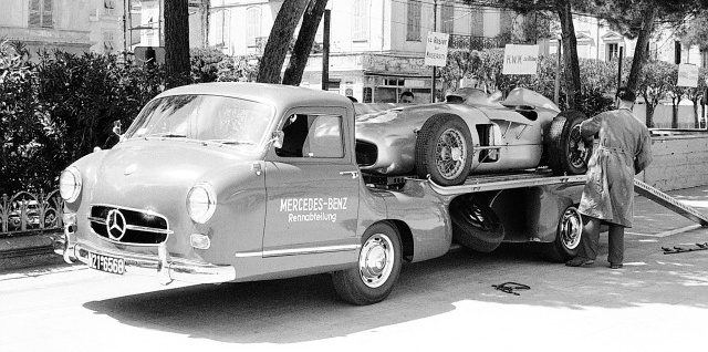 Mit dem W 196 R kehrt Mercedes-Benz 1954 nach 15 Jahren Unterbrechung in den Grand-Prix-Sport zurück. Der neue Formel-1-Wagen ist nach dem gerade erst in Kraft getretenen Reglement konstruiert, das maximal 2,5 Liter Hubraum vorschreibt. Gleich beim ersten Rennen am 4. Juli 1954 in Reims landen Juan Manuel Fangio und Karl Kling einen Doppelsieg. An den Start geht die futuristisch anmutende, für schnelle Rennstrecken konzipierte Version mit Stromlinienkarosserie. Bei den meisten Formel-1-Rennen der Jahre 1954 und 1955 kommt jedoch die Version mit frei stehenden Rädern zum Einsatz. Diese ist für kurvenreiche Strecken besser geeignet, weil der Fahrer die Vorderräder stets im Blick hat. Die Premiere dieser Variante beim Großen Preis von Europa auf dem Nürburgring im August 1954 endet ebenfalls mit einem Sieg von Juan Manuel Fangio. Der W 196 R erringt 1954 drei weitere Siege, im Folgejahr sogar sechs, und Fangio wird in beiden Jahren Formel-1-Weltmeister.
