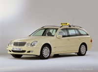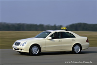 Im März 2002 löste die neue E-Klasse der Baureihe 211 die Baureihe 210 ab. Mit dieser mittlerweile achten Generation der oberen Mittelklasse der Marke seit dem Zweiten Weltkrieg schlugen die Stuttgarter Ingenieure und Designer ein neues Kapitel in einer beispiellosen Erfolgsgeschichte auf. Das Sondermodell E 200 CDI »Das Taxi« verfügt über eine Sonderausstattung, die unter anderem einen in den Innenspiegel integrierten Taxameter, ein elektrisches Schiebe-Hebedach in Glasausführung und das COMAND APS mit Kartennavigation. Das Design der Baureihe W 211 nahm Elemente wie das Vier-Augen-Gesicht des W 210 auf, interpretierte sie jedoch erfrischend neu. Der W 211 überzeugt mit einem sehr sportlichen, dynamischen Auftritt. Dem entspricht die hohe Agilität, die die Limousine und das 2003 präsentierte T-Modell unter Beweis stellen. Gutes Arbeitsklima in allen Taxis von Mercedes-Benz garantiert zum Beispiel die Motor-Restwärmeanlage, die den Innenraum bis zu 30 Minuten lang auch im Stand angenehm warm hält. Weitere nützliche Ausstattungselemente wie zum Beispiel die Funk-Freisprecheinrichtung mit Radio-Stummschaltung sorgen für noch mehr Komfort. Vom Taxi-Bestseller E-Klasse werden ca. 80 Prozent mit einem Dieselmotor ausgeliefert. Die CDI-Motoren des W 211 hatten mit ihrer Common-Rail-Direkteinspritzung, Ladeluftkühlung und Turbolader mit variabler Turbinengeometrie bereits Maßstäbe gesetzt.