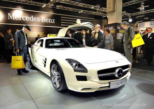 Auf der Europäischen Taximesse 2010 in Köln präsentierte Daimler das schnellste Taxi der Welt, den Mercedes-Benz SLS AMG. Dabei handelt es sich natürlich um ein reines Show-Taxi, das dem Flügeltürer die beiden in Deutschland erforderlichen Türen auf der rechten Seite fehlen.