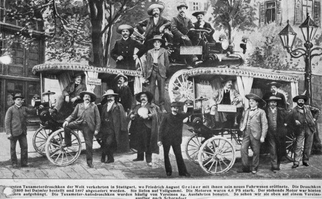 Lange muss Daimler nicht warten. Der Stuttgarter Fuhr- und Droschkenunternehmer Friedrich August Greiner bestellt am 26. Juni 1896 unter der Auftragsnummer 1329 bei der DMG eine motorisierte Victoria-Kutsche als Landaulet mit Taxameter, die er im Mai 1897 erhält. Die erste Motordroschke der Welt steht auf der Straße und nimmt noch im Juni ihren öffentlichen, polizeilich genehmigten Betrieb auf. Dieses Gefährt kostet das kleine Vermögen von 5530 Mark. Im Lieferpreis inbegriffen sind das Landaulet-Halbverdeck, zwei Spritzleder, der Rückwärtsgang und Vollgummiräder. Den Taxameter muss Greiner extra anmieten.