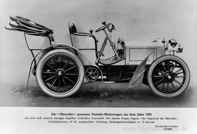Im April 1900 wird Mercedes zur Produktbezeichnung, als Jellinek und die DMG eine Vereinbarung über den Vertrieb von Wagen und Motoren treffen und Daimler die Entwicklung eines neuen Motors zusagt, der Daimler-Mercedes heißen soll. Kurz darauf bestellt Jellinek binnen weniger Wochen insgesamt 72 Wagen verschiedener Leistungsstufen bei der DMG das ist 1900 ein echter Großauftrag. Das erste mit dem neuen Motor ausgerüstete Auto, ein Rennwagen Mercedes 35 PS, wird am 22. Dezember 1900 ausgeliefert. In diesem ersten Mercedes, den wie bereits viele Fahrzeuge davor Wilhelm Maybach, Chefkonstrukteur der DMG, entworfen hat, erlebt die Entwicklung des modernen Autos einen frühen Höhepunkt: Die dynamische Evolution vom kutschenartigen Kraftwagen hin zum Automobil mit eigenständiger Formensprache hat sich ja schon länger angekündigt. Aber Maybach gelingt nun mit diesem Rennwagen ein wegweisendes Konzept. Das Automobil hat einen 5,9 Liter großen, als Frontmotor eingebauten Vierzylinder, dessen Leistung von beachtlichen 26 kW immerhin eine Höchstgeschwindigkeit von 100 km/h ermöglicht. Dazu kommen Merkmale wie niedriger Schwerpunkt, Pressstahlrahmen, die leichte Bauweise des Motors und der revolutionäre Bienenwabenkühler.