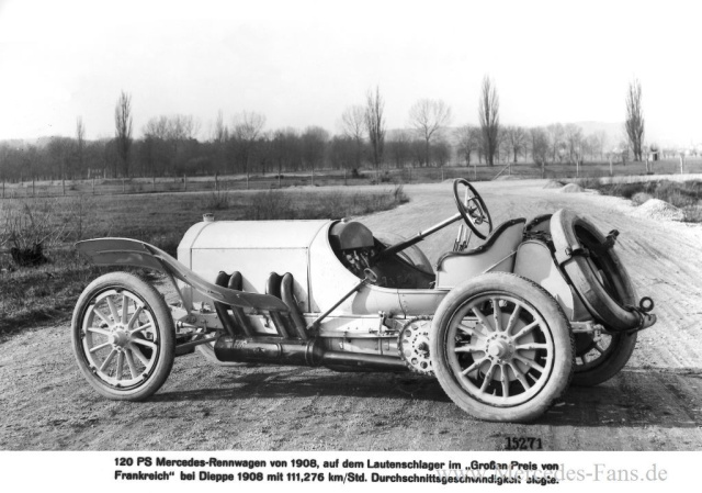 Im dritten Anlauf gelingt es der DMG, den Grand Prix von Frankreich, das prestigeträchtigste Rennen dieser Jahre, zu gewinnen: Am 7. Juli 1908 siegt Christian Lautenschlager auf dem neuen Mercedes 140 PS Grand-Prix-Rennwagen vor zwei Benz-Fahrzeugen. Auf dem 77 Kilometer langen, über öffentliche Straßen führenden Rundkurs bei Dieppe müssen zehn Runden mit insgesamt 769,88 Kilometer zurückgelegt werden. 48 Autos nehmen teil. 300.000 Zuschauer verfolgen das Spektakel. Die Rennstrecke mit ihren vielen Schlaglöchern lässt den Grand Prix zur Tortur für Männer und Maschinen werden: Einige Mannschaften fallen sogar nur deshalb aus, weil sie nicht genug Ersatz für die zahlreichen kaputten Pneus auf der schlechten Straße vorrätig haben. Auch die Reifen an den Mercedes-Fahrzeugen werden hart hergenommen, allein der spätere Sieger Christian Lautenschlager auf dem Grand-Prix-Rennwagen Mercedes 140 PS verzeichnet 22 Reifenwechsel während des Rennens. Trotz der ungünstigen Bedingungen fährt er nach 6 Stunden, 55 Minuten und 43 Sekunden als Erster ins Ziel, knapp neun Minuten vor Hémery und Hanriot, beide auf Benz. Seine Durchschnittsgeschwindigkeit über die Gesamtdistanz beträgt eindrucksvolle 111,1 km/h.