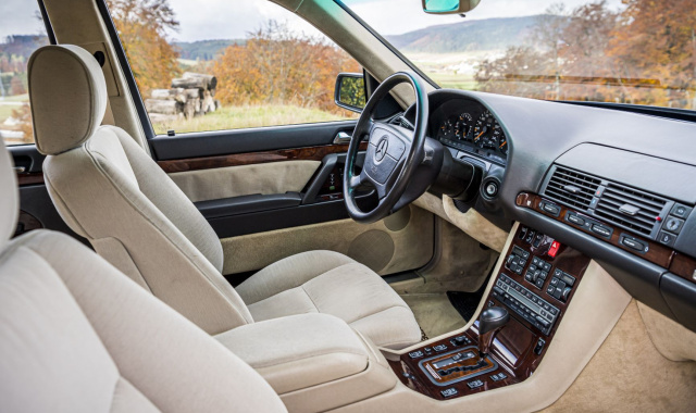 Die konsequente Stringenz der klaren und simplem Formen setzt sich im Innenraum fort. Die Interieurdesigner haben beim Gestalten des Reiseraums offenbar immer den Grundsatz vor Augen gehabt, dass die kürzeste Entfernung zwischen zwei Punkten eine Gerade ist. Die exakten Formen könnten in jedem Geometrie-Unterricht als Demonstrationsobjekt herhalten. Penible Spaltmaße, fast schon verschwenderischer Gebrauch von Holzfurnier und feines weiches Leder. Der W140 SEL 600 strahlt auch im Wohnzimmer eine Gelassenheit aus, die man heutzutage nur selten findet. Ganz ohne Spezialeffekte wie Ambiente-Beleuchtung oder Innenraumduft. Authentischer Luxus eben. Auch im Sinne der Umwelt. Der Katalysator hatte ein Volumen von sieben Litern und reduzierte so den Mehrverbrauch auf ein Minimum. Auch das Recycling spielte eine große Rolle: Viele der verbauten Kunststoffbauteile bestehen aus Regranulat, sind markiert, wiederverwertbar und eindeutig gekennzeichnet. Schon wenige Monate nach dem Debüt kam das FCKW-freie Kältemittel R134a anstelle der bislang verwendeten R12-Substanz zum Einsatz.