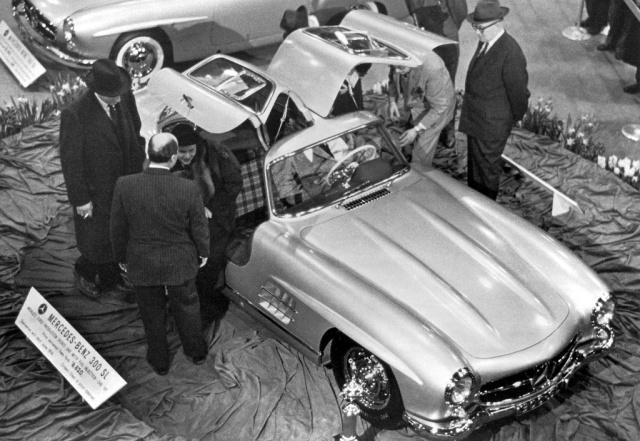 Was für ein Debüt: Am 6. Februar 1954 präsentiert Mercedes-Benz auf der International Motor Sports Show in New York den 300 SL Seriensportwagen (W 198). Neben ihm auf der Messe steht der fast seriennahe Prototyp des zukünftigen 190 SL Roadsters (W 121). Beide Fahrzeuge begründen die direkte Tradition der Seriensportwagen mit dem rennsportgekrönten Kürzel SL. Besonders stark setzt sich Maximilian E. Hoffman als Impulsgeber für sie ein, Importeur von Mercedes-Benz für den US-Markt. Der 300 SL begeistert als Coupé mit seinen charakteristischen Flügeltüren Experten und Publikum. Nicht nur die Form erinnert an den Rennsportwagen, auch technische Details wie der Gitterrohrrahmen stammen aus dem erfolgreichen Wettbewerbsfahrzeug. Das macht den 300 SL einzigartig unter den Seriensportwagen der Epoche. Die konstruktiv notwendigen, am Dach angeschlagenen Türen bringen ihm die Namen „Gullwing“ (Möwenschwinge), „Papillon“ (Schmetterling) und „Flügeltürer“ ein.
