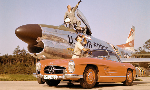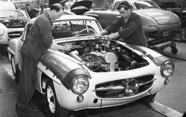 Der Motor M 198 mit Benzindirekteinspritzung wird ursprünglich für den Rennsportprototyp des Jahres 1953 entwickelt. Im Seriensportwagen leistet der Reihensechszylindermotor bis zu 158 kW (215 PS). Damit erreicht das Fahrzeug eine Höchstgeschwindigkeit je nach Hinterachsübersetzung von 260 km/h. Für einen Straßensportwagen jener Zeit ist das ein beeindruckender Wert. Das unterstreichen die Erfolge des 300 SL bei Rennen und Rallyes mit zahlreichen Siegen sowie Meistertiteln. Der 300 SL ist ein Supersportwagen seiner Zeit. Das spiegelt sich auch im Preis von 29.000 DM wider. Zum Vergleich: Ein Mercedes-Benz 220 (W 180), ein Vorgänger der heutigen S-Klasse, ist zur gleichen Zeit für rund 12.500 DM zu haben. Der 300 SL wird zur automobilen Ikone der 1950er-Jahre mit einer bis heute ungebrochenen Strahlkraft: 1999 wird er von einer internationalen Fachjury zum „Sportwagen des Jahrhunderts“ gewählt. Von 1954 bis 1957 entstehen insgesamt 1.400 Coupés des 300 SL. Davon haben 29 eine Aluminiumkarosserie, und ein Einzelstück erhält zu Erprobungszwecken einen Aufbau aus dem damals neuartigen Werkstoff GFK (glasfaserverstärkter Kunststoff).