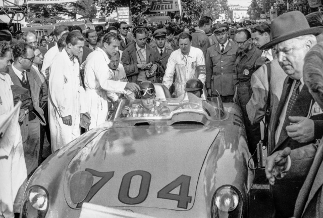 Der am 28. Februar 1928 in Stuttgart geborene Hans Herrmann beginnt seine Rennsportkarriere im Jahr 1952 bei der Hessischen Winterfahrt mit einem privaten Porsche 356. Noch im gleichen Jahr erringt der gelernte Konditor bei der Deutschlandfahrt einen Klassensieg. 1953 und 1954 holt Herrmann dann auf Porsche jeweils einen Klassensieg beim legendären 1.000-Meilen-Rennen „Mille Miglia“ in Italien. Der Stuttgarter erweist sich mit Teilnahmen an Grand-Prix-Rennen der Formel 1 und Formel 2, bei Sportwagenrennen und bei Rallyes als ausgesprochen vielseitiger Motorsportler. Außer auf den Wagen von Mercedes-Benz startet er insbesondere mit Renn- und Sportwagen von Porsche. Dazu kommen Einsätze in den Cockpits von B.R.M.-, Cooper-, Maserati- und Veritas-Rennwagen.