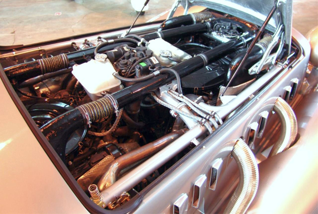 Knüller des 5,6 Meter langen Autobahnkurier mit den freistehenden Kotflügeln und den großen Scheinwerfern sind seine Antriebsaggregate. Jawohl, Aggregate, im Plural. Denn Schulz installiert unter der rund zwei Meter langen Motorhaube gleich zwei V8-Motoren von Mercedes-Benz mit je fünf Litern Hubraum und rund 300 PS. Damit hat der vierradgetriebene Wagen satte zehn Liter Hubraum und 600 Pferdestärken, dazu sagenhafte 900 Nm bei 2.700 U/min, gekoppelt an eine Fünf-Gang-Automatik. Und weil es so schön ist, hat der Isdera auch gleich zwei Anlasserknöpfe. Beide Triebswerke arbeiten voneinander unabhängig. Der vordere Motor treibt die Vorderräder an. Der zweite, hintere Motor treibt die Räder am Heck. So kann der Wagen wahlweise mit Vorderrad- oder mit Hinterradantrieb – und natürlich auch mit Allradantrieb – bewegt werden. Das Isdera-Team verrät, dass der Antrieb ausbaufähig sei – etwa in Richtung Hybrid.