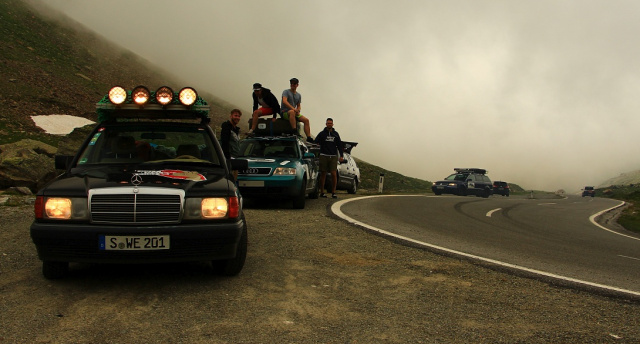 Nun stehen wir in großer Runde mit Blick auf den See. Voller Erwartungen auf die Instruktionen. Der Tag wird einschließlich Routen-Empfehlungen besprochen. Wir schließen uns mit zwei anderen Teams zusammen, müssen an einem der anderen Autos noch kurz eine Hydraulik-Leitung flicken (Was für ein Benz das nur gewesen sein kann), planen die heutige Route und dann starten wir in die erste Etappe. Nach Durchfahren des Ötztals geht es über das Timmelsjoch am Gardasee vorbei in die Lombardei. Alles dauert länger als gedacht, die vorgegebenen Zeiten sind knapp bemessen. Wir fahren durch wunderschöne Alpenzüge, doch viel Zeit den Ausblick zu genießen bleibt leider nicht, das vom Startpunkt 470 km entfernte Etappenziel liegt noch weit vor uns. Der kleine vollbepackte 1.8er kämpft sich wacker die Serpentinen hoch. Die Kühlmitteltemperatur bleibt im Rahmen. Die Temperatur der Bremsen bei der Abfahrt wird hingegen kritisch: Kurz vor dem nahenden Tal wird das Bremspedal dann langsam weich. Aber alles geht gut und mit Einbruch der Dunkelheit erreichen wir unser Rallyecamp über mini kleine Sträßlein.