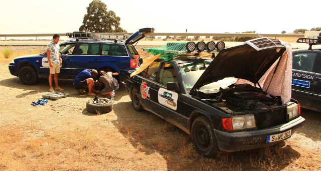 Abkühlpause für unseren 190er. Andere Teams eilen zur Hilfe – und müssen erst Mal selbst Reifen wechseln