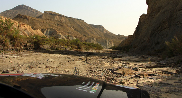 „Die Strecke ist mindestens Kategorie 6! Die letzte Tages-Mission, das Auto heil ans Ziel zu bringen, wollen sie uns auf den letzten Metern noch richtig schwer machen!“ heißt es über das Funkgerät. Kurz darauf verlassen wir die asphaltierte Straße, leicht bergab, bis wir an ein ausgetrocknetes Flussbett gelangen. Die Routen-Beschreibung sagt uns nun: „Folgt dem Flussbett bis ins Ziel“. Also los! Der Funkspruch bewahrheitet sich: Es wird hart!