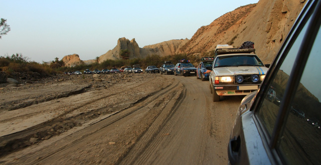 Ausgewaschene Spurrillen, trockener Flussschleudersand, hoch herausstehende Steine, Absätze und immer mal wieder Wasserlöcher. Ganz langsam und vorsichtig tasten wir uns vor, versuchen die meisten Unwegsamkeiten clever zu umfahren. Das Auto hängt einfach zu tief. Immer wieder schleift es leicht. Ab und an kracht es am Unterboden, wenn wir ein Loch oder einen Stein übersehen. Zeitweise läuft einer voraus und schaut, dass wir nicht an der Ölwanne aufsetzen. Auf einmal ein knarzendes/reißendes Geräusch. Mich überkommt ein ungutes Gefühl, was jetzt passiert sein könnte. Aussteigen, nachschauen und die Bestätigung sehen: Der Stoßfänger hinten (er hing ohnehin schon leicht runter) hat sich links an einem Stein verkeilt und ist dort liegen geblieben, während das Auto weiterfährt. Ergebnis: Die Kunststoffverkleidung fährt ab sofort auf dem Dach mit – der größte Schaden der Reise – aber wo gehobelt wird fallen ja bekanntlich Späne. Nach einigen weiteren schwierigen Passagen tauchen am Horizont Fahnen auf und man sieht Autos in der Sonne glitzern. Die letzten Meter über Schleudersand und Schotter und dann ist das lang ersehnte Ziel erreicht: Nach 3.436 km sind wir im Ziel unserer Rallye in der Nähe von Almería im Süden Spaniens angekommen! Große Freude! Party mit allen 72 Teams, die es mit uns geschafft haben! Nach großem Autokorso nach Almería lassen wir den Abend in der Stadt ausklingen.