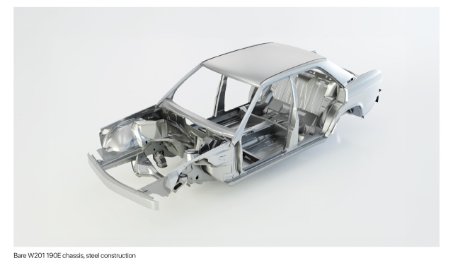 Jeder HWA EVO beginnt mit einem handverlesenen Mercedes-Benz W201, welcher auf sein originales Stahlchassis zurückgebaut und sorgfältig geprüft wird, um den hohen Qualitätsstandards von HWA gerecht zu werden. Um moderne Leistung und Sicherheitsstandards zu erreichen, werden bereits in diesem frühen Stadium umfassende Modifikationen vorgenommen.