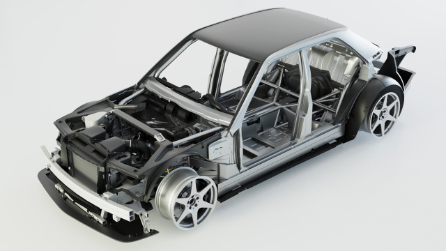 Der verstärkte Mittelteil des originalen Chassis – einschließlich der A-, B- und C-Säulen – sorgt dafür, dass die Energie effizient durch die neue, robuste Struktur geleitet wird. Im Gegensatz zum ursprünglichen W201 weist der HWA EVO mehr als die doppelte Torsionssteifigkeit auf, vergleichbar mit einem hochmodernen Serien-Supersportwagen. Insgesamt werden rund 75% des Originalfahrzeugs ersetzt, bevor das vollständige Chassis eine kathodische Tauchlackierung (KTL) für Korrosionsschutz auf OEM-Niveau erhält.