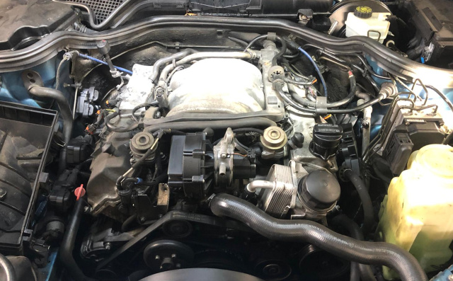 Als ich dann zum betreuten Schrauben nach Dorsten fuhr, war ich selbstverständlich felsenfest davon überzeugt, dass das auch dieses Mal wieder ähnlich laufen würde. Also ab auf die Hebebühne und nach kurzer Einweisung fing ich an, die Motorverkleidung, den Luftfilterkasten und alles, was bei der Reparatur im Weg war, auszubauen. Hierbei war mir schnell klar, dass ein Auto aus 1999 ganz anders konstruiert wurde, als die Klassiker, die ich gewohnt war. Alles ist enger, fummeliger und schlechter erreichbar, als bei einer Pagode oder einem W123. Ich wünschte mir unsere Kinder Max und Lilly herbei die mit ihren kleinen Patschhändchen in die Ecken kämen, wo ich mit meinen Klodeckel-Händen entweder steckenblieb oder nur mit zwei Fingerspitzen an die Schrauben kam. Caren, die Frau von Andreas hatte mich inzwischen in der Werkstatt erstmal mit Keksen und Kaffee versorgt. Schrauben, wie im 5-Sterne Hotel!
