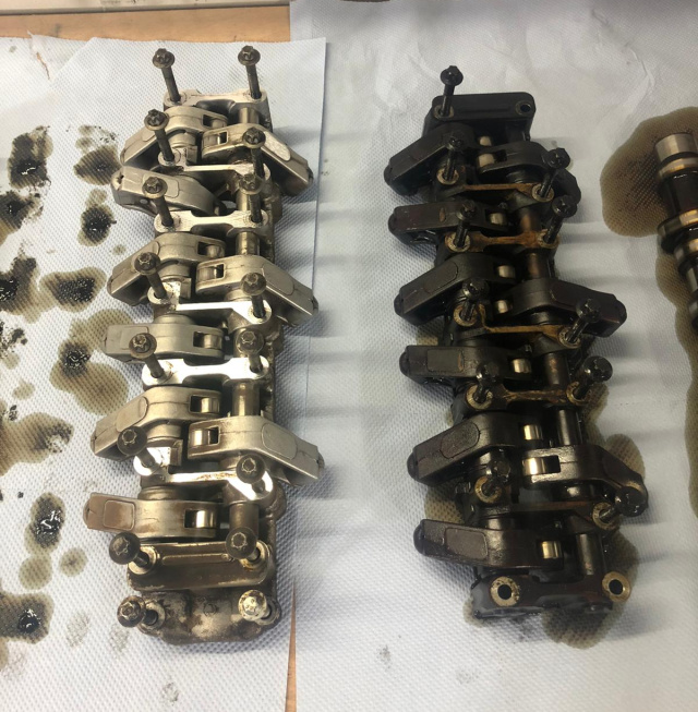 Zurück auf die Hebebühne. Dass der Zombie hier wirkt, wie die Kelly Family in ihren besten Zeiten bei den Wiener Philharmonikern, braucht man wohl nicht extra erklären. Ich schämte mich ein wenig für den technischen Pflegezustand, der wenigstens nicht auf meinem Mist gewachsen war. So staunten die beiden Mechaniker, die mich betreuten und die kniffeligen Aufgaben übernahmen, die ich mir nicht zutraute (…also fast alle, bis auf das Auseinanderbauen), wo überall Öl raus tropfte und dass der Zylinderkopf von innen die Farbe hatte, wie Sohle7 auf Zeche Zollverein – kohlrabenschwarz! Da der Ventiltrieb samt Nockenwellen gerade eh ausgebaut war, habe ich die Teile zwischendrin in einer Reinigungskabine hochdruck-geduscht. Siehe da – alles wieder wie neu.