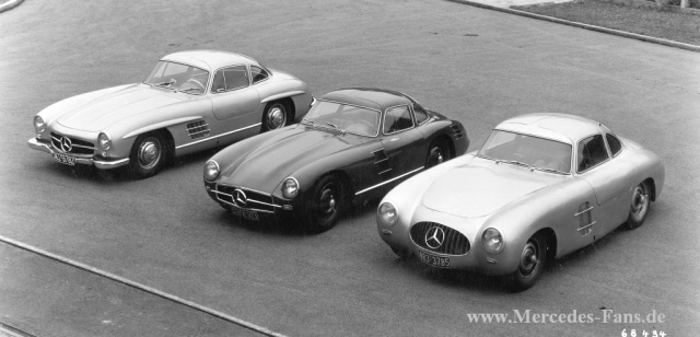 Drei Versionen des Mercedes-Benz Typ 300 SL auf einen Blick: Links der Mercedes-Benz Rennsportwagen 300 SL (W 194) von 1952, daneben der Rennsportprototyp (Chassisnummer W 194 011) für die Rennsaison 1953 (dieser Prototyp kam nicht zum Renneinsatz), dann der Serienwagen (W 198) des Jahres 1954.