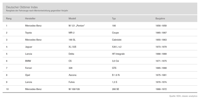 Bemerkenswert bei der Wertentwicklung einzelner Fahrzeuge zum Vorjahr ist der Aufschwung von zwei Mercedes-Benz-Fahrzeugen aus den 1950er Jahren. So machte der lange Zeit fast unbeachtete Mercedes 190 „Ponton“ einen gewaltigen Sprung an die Spitze der Top Ten. Auf Platz 3 der Rangliste findet sich der Mercedes-Benz 190 SL. Mit seiner Preisentwicklung bewegt er sich aufgrund der ähnlichen Optik im Sog des legendären 300 SL. Der Toyota MR2 zeigt mit Platz 2 erneut, dass sich japanische Sportwagen in der deutschen Oldtimer-Szene zunehmender Beliebtheit erfreuen.
