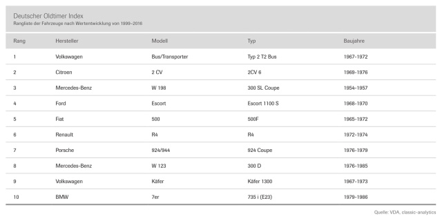 Berechnet wird der Deutsche Oldtimerindex seit 1999. Absoluter Spitzenreiter in der Langzeitwertentwicklung ist der beliebte Volkswagen Bus Typ 2. Den zweitstärksten prozentualen Wertzuwachs seit 1999 verzeichnete die „Ente“ oder Citroën 2CV. Platz 3 bei der Entwicklung seit 1999 belegt der Mercedes-Benz 300 SL „Flügeltürer“. Als einziger Aufsteiger in die Top Ten schafft es der Mercedes-Benz W 123, ein Volumenmodell der oberen Mittelklasse, das von 1975 bis 1986 gebaut wurde, auf Platz 8.