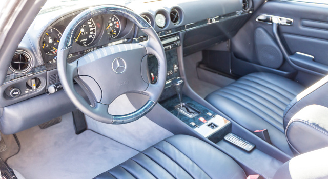 Begonnen bei einer komplett Vollverzinkung der Karosserie bis hin zum perfekten mehrschichtigen Mitternachtblau- und Klarlack. Auch der Ersatz der einteiligen AMG gegen die seltenen dreiteiligen 17 Zoll Felgen (Vo: 8,5Jx17“/Hi: 10Jx17“) mit in Wagenfarbe lackiertem Felgenstern sowie das generalüberholte AMG-Spoiler-Paket und eine Tieferlegung mit Erneuerung aller Buchsen und Lager der Achsen waren Teil der Erfrischungskur. Zusätzliche Arbeit ist in die Individualisierung des Interieurs geflossen, in dem nun überall neues dunkelblaues Leder und dunkelblaues Vogelaugen-Ahorn-Holz, eine große aber sich dezent einfügende Soundanlage, ein Tempomat, ein Tacho bis 300km/h mit etwas über 3000km angezeigter Laufleistung, ein Holz-Lederlenkrad mit Multifunktionsbedienelementen für das eingebundene Interface-Radio und und und auf die Insassen wartet.