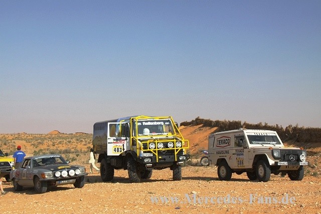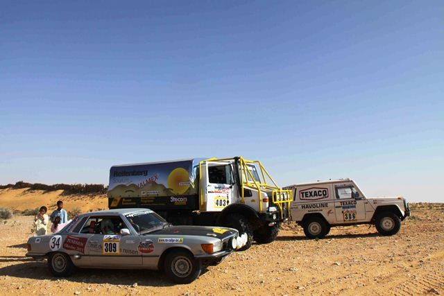 Die drei Mercedes Oldtimer erfreuten sich großer Sympathie unter den Rallye-Teilnehmern, war ihr Auftritt doch immer eine große Schau. Der SLC pflügte spektakulär stets quer durchs Gelände, der 280GE betörte mit seinem Wahnsinns Sound und der Unimog zog seine Bahnen in den Dünen gerade wie mit dem Lineal gezogen.