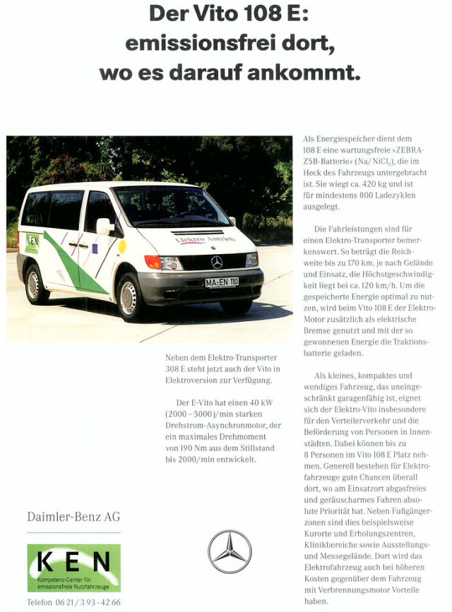 Vor 25 Jahren erblickte der Mercedes-Benz Vito 108 E auf Basis der Baureihe W 638 das Licht der Erde. Als kleines, kompaktes und wendiges Fahrzeug, das uneingeschränkt garagenfähig ist, eignet sich der Elektro-Vito insbesondere für den Verteilerverkehr und die Beförderung von Personen in Innenstädten“, beschreibt ein Informationsblatt mögliche Einsatzgebiete. Bis zu acht Personen können im Vito 108 E Platz nehmen. Die Nutzlast beträgt 600 Kilogramm. Seine Fahrleistungen: eine Höchstgeschwindigkeit von 120 km/h und eine Reichweite von bis zu 170 Kilometern. Heute soll der neue Mercedes-Benz eVito Tourer immerhin über 400 Kilometer schaffen.