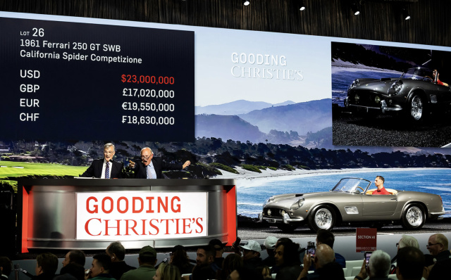 Auch das Auktionshaus Gooding Christie’s ist nach der wichtigsten Versteigerung des Jahres in Pebble Beach zufrieden, denn die erlösten 128 Millionen US-Dollar waren für sie eine der umsatzstärksten Auktionen aller Zeiten; knapp 20 Prozent mehr als im vergangenen Jahr. Teuerstes Fahrzeug: ein 1961er Ferrari 250 GT SWB California Spider Competizione, der für 25,3 Millionen US-Dollar verkauft wurde. „Dieser Verkauf war nicht nur der teuerste, den Gooding Christie's und sein Team jemals getätigt haben, sondern der California Spider Competizione stellte auch einen persönlichen Rekord für mich auf“, sagt Charlie Ross, Hauptauktionator bei Gooding, „der letztendliche Käufer hat uns eine Lektion darin erteilt, wie man ein Auto bei einer Auktion kauft ... entschlossen, entschlossen, klar und schnell!“ An zwei Tagen wurden von den 153 Fahrzeugen 85 Prozent verkauft; knapp 30 Lose über eine Million US-Dollar verkauft bei einem Durchschnittspreis pro Fahrzeug von 847.262 US-Dollar. Auch hier besonders beliebt: jüngere Modelle und Sportwagen mit spezieller Historie aus den 1960er und 1970er Jahren. So erzielte ein Ferrari 365 GTB/4 Daytona Competizione Series III von 1973 mehr als 8,1 Millionen US-Dollar und ein Ferrari Dino 246 GTS von 1974 knapp über eine Million Dollar.