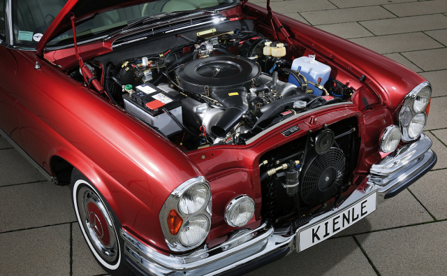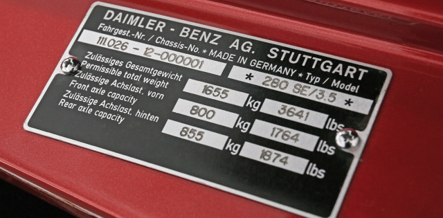 Die Fahrgestell-Endnummer 000001 weist das rot metallic lackierte Coupé als erstes Exemplar des 280 SE 3.5 Coupés aus. Der geschmeidig laufende V8-Motor mit elektronisch geregelter Bosch D-Jetronic-Saugrohreinspritzung leistet 200 PS und sorgt für ansprechende Fahrleistungen: Neun Sekunden für den Spurt auf 100 km/h und eine Höchstgeschwindigkeit von 210 km/h sind Werte, die 1969 denen eines Porsche 911 E entsprachen.