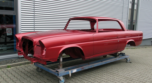 Es gehört zur Kienle Philosophie, einen Klassiker erst nach eingehender Untersuchung mit Teildemontage oder gar erst nach kompletter Restaurierung zum Auslieferungszustand anzubieten. Das gilt auch für dieses Auto, und so ging es in der Kienle Werkstatt flugs an die Arbeit. Bei dem Coupé in der Mercedes-Farbe 571 (rot metallic) stießen die Kienle Karosseriebauer schon bald auf einige erfreuliche Details: Auf dem Getriebetunnel beispielsweise schimmerte nach dem Entlacken der handschriftliche Vermerk „Pressewagen“*. Der endgültige Beweis, dass es sich um ein Presse-Fahrzeug handelt, fand sich in Form des werksinternen Produktionsauftrags vom 29.5.1969, „W111 Coupé mit M116 für Pressevorführung“.