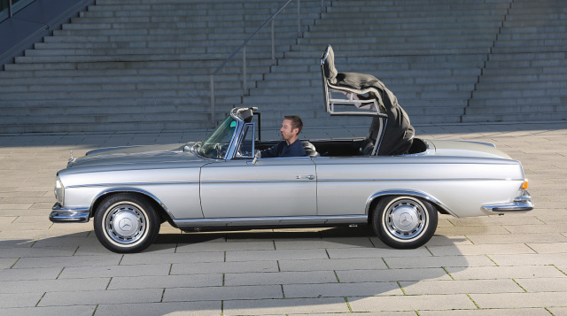 Auch das 3,5-Liter-Cabriolet kann sich sehen lassen, obwohl es sich noch in unrestauriertem Originalzustand befindet. Es wurde früher (vermutlich im Werk) von Beige auf Silber umlackiert. Doch mit seinem Hauch von Patina übt es einen ganz besonderen Reiz aus – und überrascht Kenner der W111-Baureihe: Sein Dach muss nicht in Handarbeit auf- und zugeklappt werden, sondern öffnet und schließt sich hydraulisch nahezu geräuschlos per Knopfdruck. Dass es in der Geschichte der W111-Baureihe ein solches Automatik-Verdeck gab, wissen nur eine wenige Spezialisten.