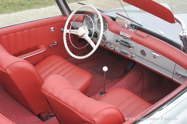 Auch das Interieur des Cabriolets wurde nicht vergessen und so nahm sich Willy Sellerie aus Nizza u.a. den Sitzen, Türverkleidungen an und verlegte ebenfalls einen neuen Teppich. Komplettiert wurde der Mercedes-Benz schließlich bei Team VB 14 aus Monaco, bevor der Besitzer diesen nach Großbritannien zurückholte, wo John Haynes aus Worthing (GB), die Feinarbeiten erledigte, einen Satz Weißwandreifen montierte und das Getriebe reparierte.