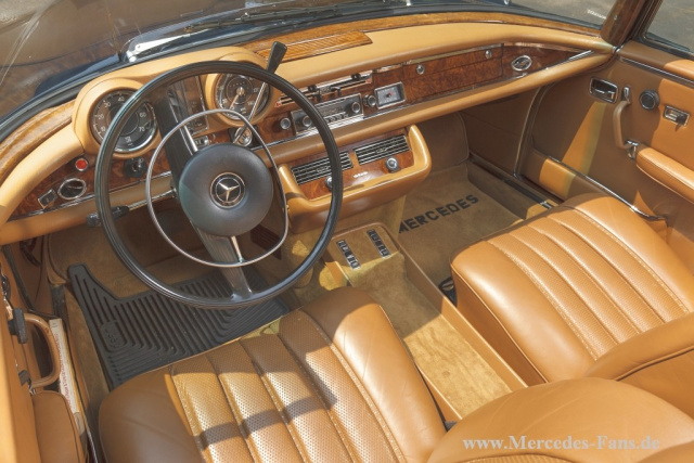 Das 1970er Mercedes-Benz 280SE 3.5 Cabriolet der Baureihe W 111 folgte wie die Limousine den Heckflossen mit runderen, nur noch im Ansatz erkennbaren Finnen. Nicht ein Teil der Karosserie der Limousinen passte an die Cabriolets oder Coupés, obwohl die Modelle auf der ungekürzten Rahmen-Boden-Anlage der Limousine aufbauten. Weshalb man bei Mercedes-Benz seinerzeit viele Teile in Handarbeit fertigen musste, was natürlich den Preis in die Höhe schnellen ließ.