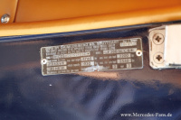 Das Cabriolet ist in zweiter Hand seit 1970 und stand die letzten 20 Jahre in der Garage eines Besitzers, der sich stets um seinen Mercedes-Klassiker bemühte. Schon beim Erstbesitzer erhielt das Convertible das nun gerade einmal 98.500 Meilen, also 160.000 km, auf der Uhr hat wohl die neue Lackierung in Dunkelblau, die aber gut zu dem beigefarbenen Leder und blauem Verdeckstoff passt. Der aktuelle Besitzer hat dem Wagen einen Satz neuer Reifen in korrekter Dimension spendiert, und dabei auch nicht das Reserverad vergessen.
