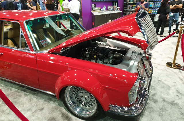 Der starke Hochleistungsmotor des 280 SEL wurde von der Firma Reviva zusammengebaut. Ähnlich wie bei der „echten“ Roten Sau steckt auch in diesem Showcar eine echte Hammer-Kammer. Angetrieben wird das Beast von einem 6,7 Liter großen V8 mit 607 Pferdestärken. Dazu leistet die Maschine über 800 Newtonmeter Drehmoment. Viva Las Vegas!