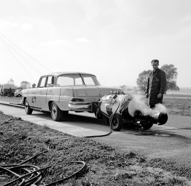 Für eine zuverlässigere Beschleunigung der Wagen Richtung Aufprall oder Überschlag sorgt ab 1962 die von Ernst Fiala konstruierte Heißwasserrakete. Sie befindet sich auf einem einachsigen Anhänger, der hinter dem Versuchswagen rollt. In ihrem Inneren wird Wasser bis auf etwa 260 °C erhitzt, der Druck des entstehenden Wasserdampfes entweicht über ein schnell öffnendes Ventil und eine Ausströmdüse. Das Ganze beschleunigt das Gespann auf mehr als 100 Stundenkilometer, eine Eisenbahnschiene sorgt dabei für eine sichere Spurführung. Gleichzeitig wird auch die Teststrecke selbst optimiert: Sie erhält als Basis eine ebene Stahlbetonplatte, ein Fangzaun verhindert, das weitere Mercedes ungewollt in der Schwippe landen. 1964 wird die Strecke schließlich auf 90 Meter verlängert, um auch schwere Personenwagen wie den Typ 600 crashen zu können.
