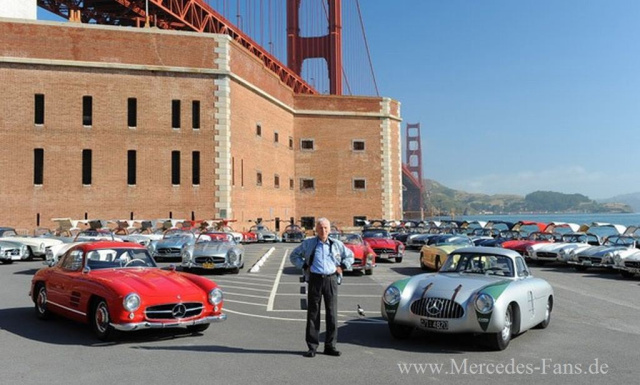 50 Jahre ist es her, dass sich die "Gull Wing Group", eine Gruppe amerikanischer Mercedes 300 SL-Besitzer, am Fuße der Golden Gate Bridge in San Fransico, auf dem Vorplatz von Fort Point, für ein Gruppenfoto versammelte. 50 jahre später traf man sich wieder, um das Ereignis von einst zu feiern und zu wiederholen. Mit der Unterstützung von Mercedes-Benz USA kamen rund 100 Flügeltürer und 300 SL Roadster genau an der Stelle zusammen, wo vor 50 Jahre die Originalaufnahme entstanden war.