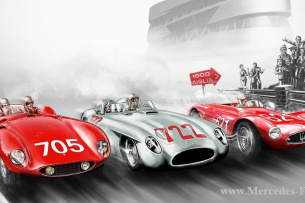Seit den legendären Mille-Erfolgen von Mercedes-Benz sind die Geschichte der Marke und die der Mille Miglia untrennbar miteinander verbunden. Zweimal fuhr Mercedes-Benz nach den 1000 Meilen als Sieger über die Ziellinie: 1931 (Rudolf Caracciola auf Typ SSKL) und 1955 (Stirling Moss auf 300 SLR). Einen weiteren Höhepunkt bildete 1952 der zweite Rang von Karl Kling, bei dem erstmals der Rennsportwagen 300 SL (W 194) zum Einsatz kam.