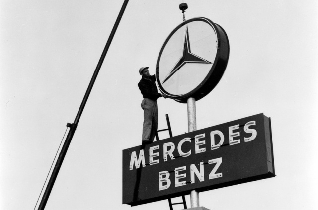 Auch im öffentlichen Raum prägt das Mercedes-Benz Markenzeichen den Auftritt des Unternehmens. Besonders eindrucksvoll sind Installationen auf den Dächern markanter Gebäude, die in der Dunkelheit beleuchtet werden können. So dreht sich beispielsweise in Deutschland ab dem 30. März 1965 ein zehn Meter hoher Mercedes-Stern auf dem Dach des Europa-Centers am Kurfürstendamm in Berlin. Das 15 Tonnen schwere Markenzeichen ist seinerzeit die größte drehbare und hydraulisch kippbare Neonanlage überhaupt. Auch in Hollywood wird der Mercedes-Stern seit dieser Zeit prominent genutzt – so wie überall in herausragenden Städten der ganzen Welt.