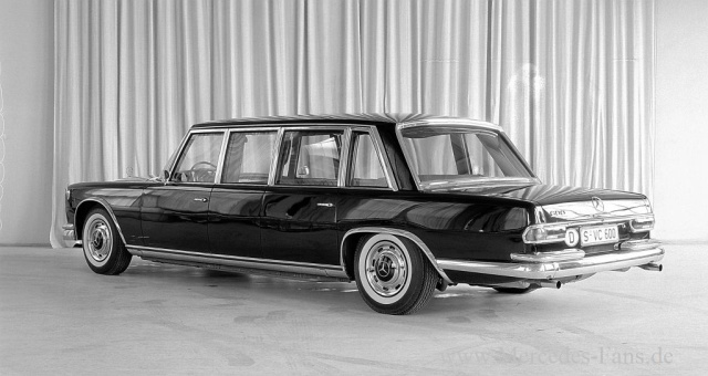 Im Juni 1965 entstand eine beschussgesicherte Pullman-Limousine - das erste bei Daimler-Benz nach dem Krieg aufgebaute Sonderschutzfahrzeug. Unter großem Termindruck wurde es gerade rechtzeitig zum Besuch von Queen Elizabeth II fertiggestellt. Die gepanzerte Pullman-Limousine hatte einen erhöhten Dachaufsatz, damit die englische Königin ihren Hut nicht abzunehmen brauchte. Von dieser großzügigen Kopffreiheit profitierten später auch andere Staatsgäste von denen damals viele einen Hut trugen.