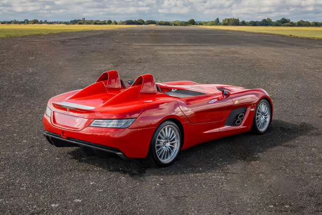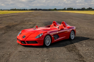 Entworfen wurde der SLR McLaren von Gordon Murray. Der Mercedes AMG V8-Motor ursprünglich über 600 PS stark leistet im Stirling Moss stramme 650 PS. Mit einer Gewichtsreduzierung von 200 kg ist der Stirling Moss auch der Sprintstärkste der SLR-Horde. Mercedes-Fans-Leser Andreas Möller und Redakteur Thomas Ebeling können ein Lied davon singen. Bei 6 Grad Außentemperatur verschwendeten die beiden keinen Gedanken ans Frieren, es galt vielmehr den Roadster, der beim Beschleunigen oberhalb von 120 km/h immer noch mit den Rädern durchdrehte, auf der Straße zu halten. Der Stirling Moss beschleunigt in nur 3,5 Sekunden von 0 auf 100 km/h und erreicht eine Höchstgeschwindigkeit von 354 km/h. Bonhams erinnert sich noch an den Preis, dieser lag für das hier gezeigte Modell bei 892.500 Euro.