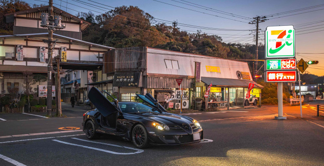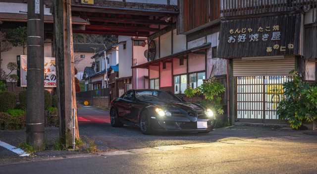 Das hier gezeigte Exemplar ist ein originaler SLR für den japanischen Markt und wurde laut dem beiliegenden Serviceheft im September 2005 erstmals an seinen Besitzer in Tokio ausgeliefert. Der jetzige Eigentümer erwarb das Fahrzeug im Jahr 2017 und entschied sich, denn SLR wieder zu McLaren zu schicken, um die exklusiven „McLaren Edition“-Upgrades zu bekommen. Dabei erhielt der Wagen zusätzlich Felgen in der Spezifikation des SLR 722 S sowie abgedunkelte Leuchten. Der Innenraum wurde vollständig neu gestaltet: schwarzes Alcantara mit roten Ziernähten und „MSO“-Schriftzügen in den Kopfstützen sowie ein neues Lenkrad, ebenfalls mit Alcantarabezug, sorgen für eine sportlich-edle Atmosphäre. Besonders beeindruckend ist die Lackierung: ein tiefes Metallic-Rot, das je nach Lichteinfall fast schwarz wirkt.