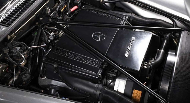 Zwei äußere Merkmale des 300 SL sind die 17 Zoll AMG-Leichtmetallräder im klassischen Fünf-Speichen-Design (mit 235/45 R17 vorne und 245/45 R17 hinten) und die elektrisch-verstellbaren Außenspiegel. Im Inneren verbirgt sich dann eine echte „Hammer-Kammer“. Hier entspricht nichts mehr dem Original. Unter der Haube hämmert ein 6,0-Liter V8. Um den M119 aufnehmen zu können, musste der Gitterrohrrahmen entsprechend modifiziert werden. Der V8 leistet 380 PS und an ihn wurde ein Vierstufenautomatikgetriebe gekoppeld.