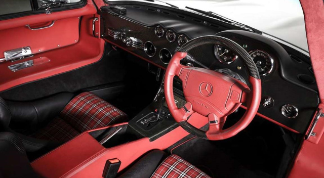 Auch beim Blick durch die geöffneten Flügeltüren auf das Interieur fällt der Umbau auf die Moderne auf. Das ursprüngliche Armaturenbrett wurde mit Echtholz veredelt und mit Leder bezogen. Anstelle der originalen Sitze fanden Recaro-Sitze Verwendung, die wie auch die Einstiege und der Türinnenverkleidungen - mit rotem Leder versehen wurden. Rotes Alcantara fand am Himmel und den Säulenverkleidungen Verwendung.