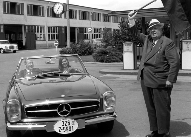 Weil auch damals schon Marketing und Kommunikation für Moss und Mercedes-Benz sehr wichtig waren, wurde die Abholung des Wagens stilsicher inszeniert. Die Bildunterschrift des Pressefotos besagt: "Der ehemalige Rennfahrer Stirling Moss, 36, wird von seinem alten Chef Alfred Neubauer, 75, 'weggeflaggt', als er Stuttgart, Deutschland, besucht, um seinen neuen Mercedes-Benz 230 SL Sportwagen abzuholen. Auf dem Beifahrersitz sitzt Stirlings Frau Elaine".