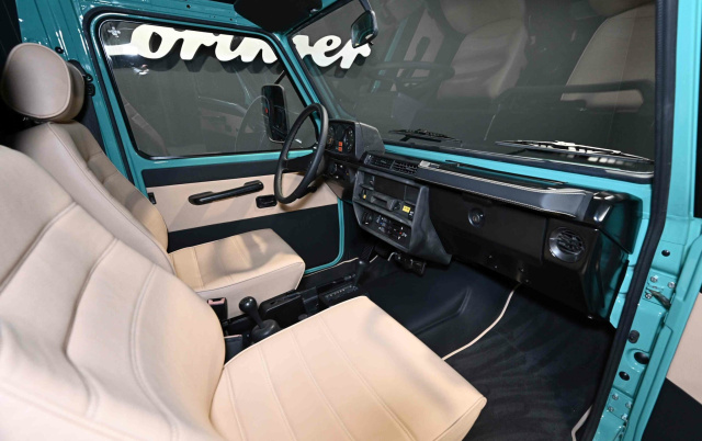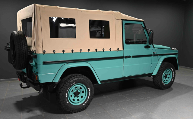 Angetrieben wird der Puch von einem 2,3-Liter großen Vierzylinder. Mittels 4-Gang-Automatik wird die Kraft wahlweise an alle vier Räder übertragen. Die 116 PS sind weniger Gedacht für schnelle Fahrten, aber optimal angelegt um sich durch das Gelände, Schlamm oder Sand zu wühlen. Passend zum minttürkisen Lack (RAL 6033) wurde das Interieur in beigen Kunstleder angelegt. Für Offroad-Charakter sorgen die Stahl-Felgen in 16 Zoll, umhüllt von grobstolligen Reifen.