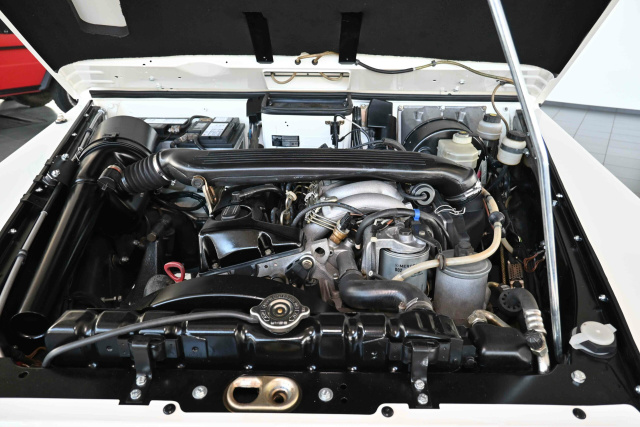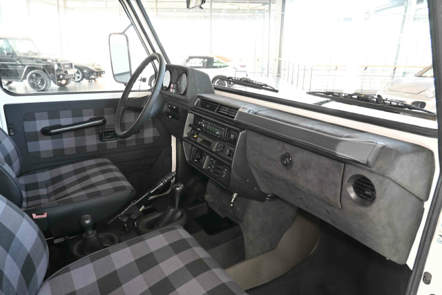 Neben der seltenen Ausführung kommt hinzu, dass dieses Exemplar erst 60.000 Kilometer auf der Uhr hat und damit wohl noch nichtmal eingefahren ist. Bei regelmäßiger Wartung und genug Pflege dürfte der 2.873cm³ große 5-Zylinder-Dieselmotor mit entschleunigenden 95 PS "ewig" fahren. Die fünf Gänge werden bei diesem Fahrzeug manuell bedient. Dazu gibt es einen zuschaltbaren Allradantrieb, eine Geländeuntersetzung und eine Differentialsperre für vorne und hinten. Dazu kommen eine Seilwinde, eine Servolenkung, Anhängerkupplung und LED-Scheinwerfer. Optisch kann der Puch 290 GD Pickup mit einer Lackierung in Firnweiß in Kombination mit einer schwarz-grauen Karo-Ausstattung punkten.