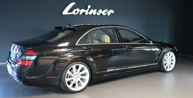 Das eigentliche Highlight ist der vollzogene, originale und umfangreiche Lorinser Umbau. Für mehr Sportoptik sorgen Lorinser RS8- Leichtmetallräder im Turbinenschaufel-Design. Dazu kommt das passende Spoilerset, bestehend aus Frontschürze inkl. Nebelscheinwerfer, Heckschürze, den extralangen Seitenschwellern für die Langversion und natürlich dem breiten Kotflügelsatz für die Vorderachse. Gut stehen der S-Klasse auch der Lorinser Heck- und Dachspoiler und damit der V8 auch von sich hören lässt, spendiert Lorinser dem S 500 noch eine passende Auspuffanlage.