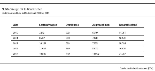 Der Bestand an Nutzfahrzeugen mit H-Kennzeichen ist in den vergangenen Jahren deutlich gewachsen. Am 1. Januar 2015 waren in Deutschland 24 067 historische Nutzfahrzeuge zugelassen. Gegenüber dem Vorjahr beträgt der Zuwachs 15 Prozent, seit 2010 ist der Bestand nach Angaben des Verbandes der Automobilindustrie (VDA) um über 70 Prozent gestiegen.