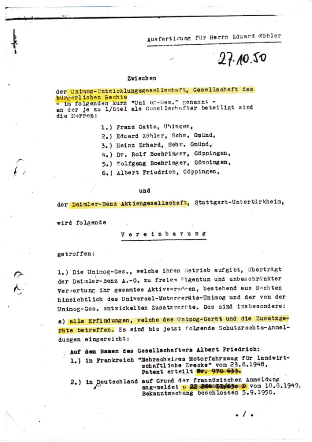 Untenstehend: Der Vertrag vom 27.10.1950 zwischen Daimler-Benz Aktiengesellschaft und der Firma Boehringer, Abteilung „Unimog-Entwicklungsgesellschaft“ über den Verkauf der Unimog Produktion an Daimler-Benz für 600.000 DM