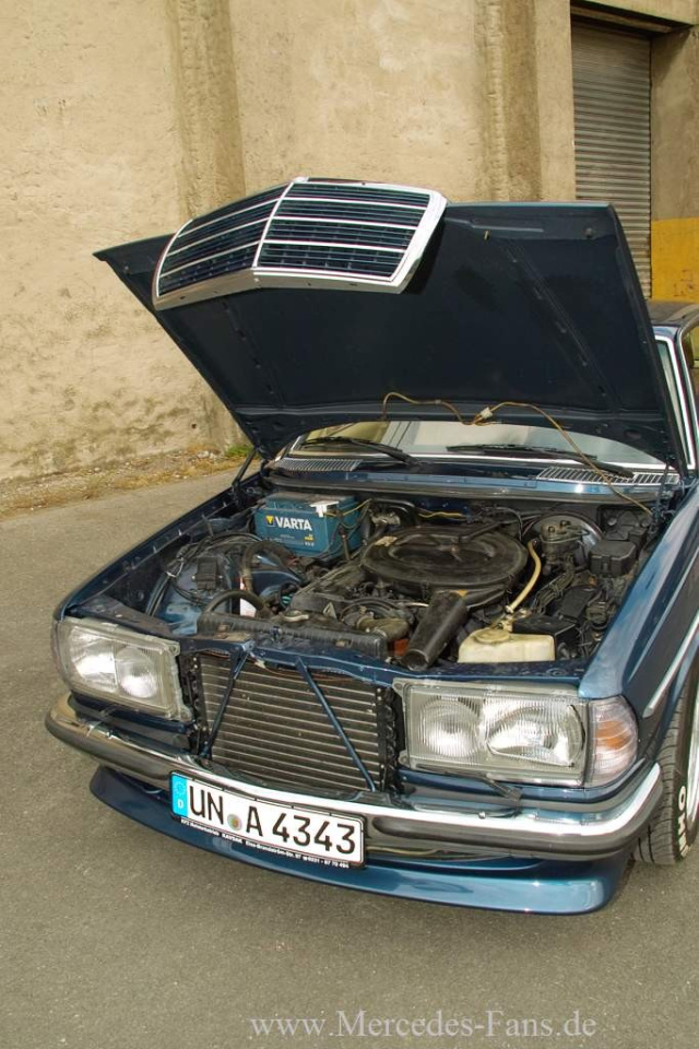 Zur Dynamisierung der Optik spendierte der Lünener seinem Mercedes 230 einen Zender-Frontspoiler. Der passt perfekt in die frühen 80er Jahre und wie ich finde auch sehr gut zum Mercedes, urteilt der begeisterte Hobby-Schrauber.